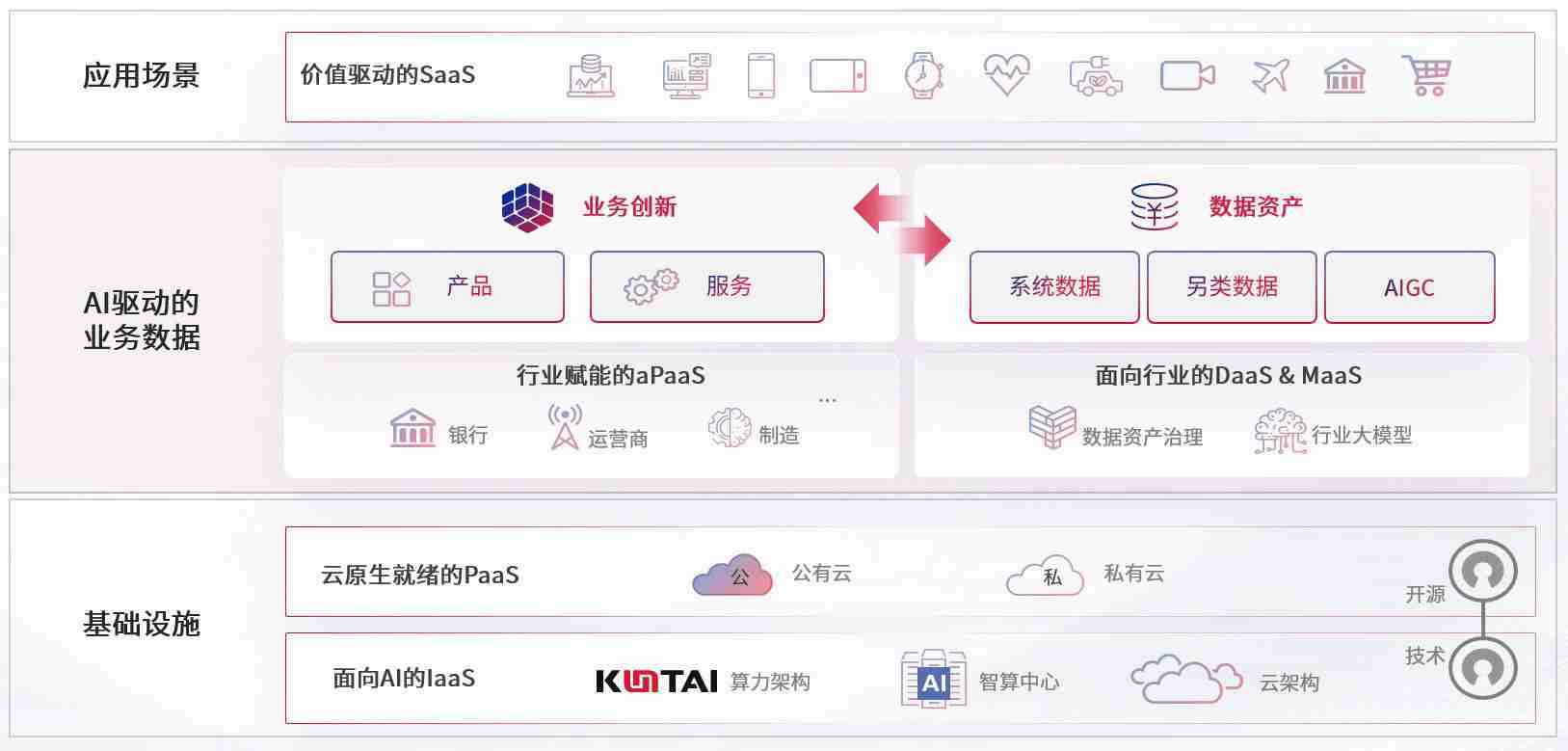 数字时代,,围绕企业数字化转型的关键要素,,,,尊龙旗舰厅数码开创性的提出数云融合战略和技术体系框架,,,着力在云原生、、、数字原生、、、、AI原生和信创产业上架构产品和服务能力,,,为处在不同数字化转型阶段的快消零售、、、汽车、、、、金融、、、医疗、、、政企、、、教育、、运营商等行业客户提供泛在的敏捷IT能力和融合的数据驱动能力,,,构建跨界融合创新的数字业务场景和新业务模式,,,助力企业级客户建立面向未来的核心能力和竞争优势,,,全面推动社会的数字化、、智能化转型升级。。